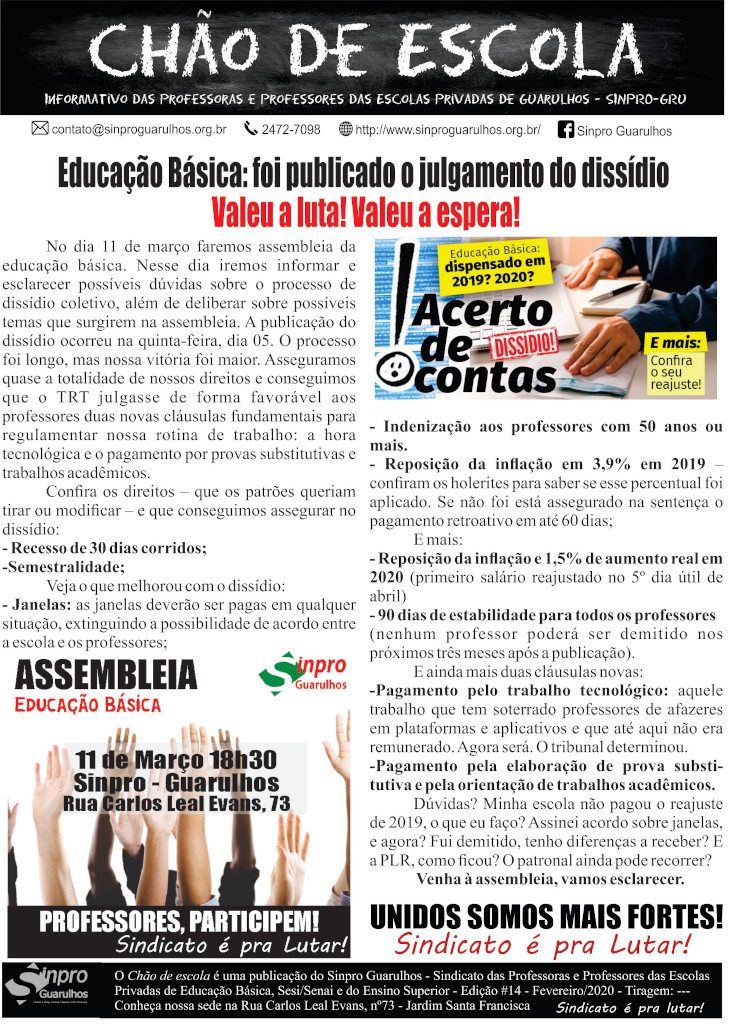 02/2020 – 14ed – Educação Básica: foi publicado o julgamento do dissídio